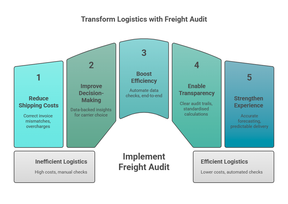 | Powering Smart Shipping Decisions | Insights from freight audits help optimise carrier allocation, refine shipping rules, and enable faster dispatch decisions. | Enables smarter, data-driven logistics strategies and cost-efficient carrier selection. |