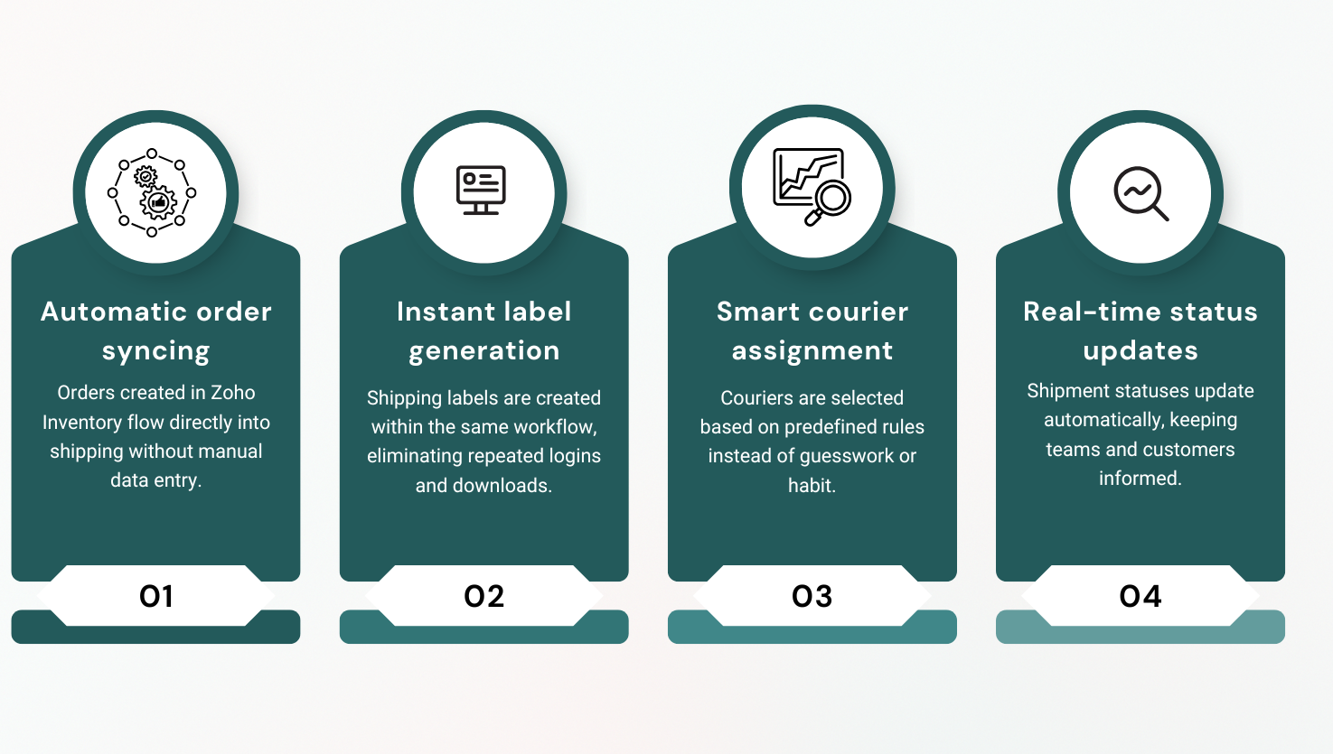 This connected approach turns Zoho into a complete ecommerce logistics software layer. Automation and visibility replace manual effort, allowing shipping operations to scale smoothly as order volumes grow, without increasing operational complexity or overhead.